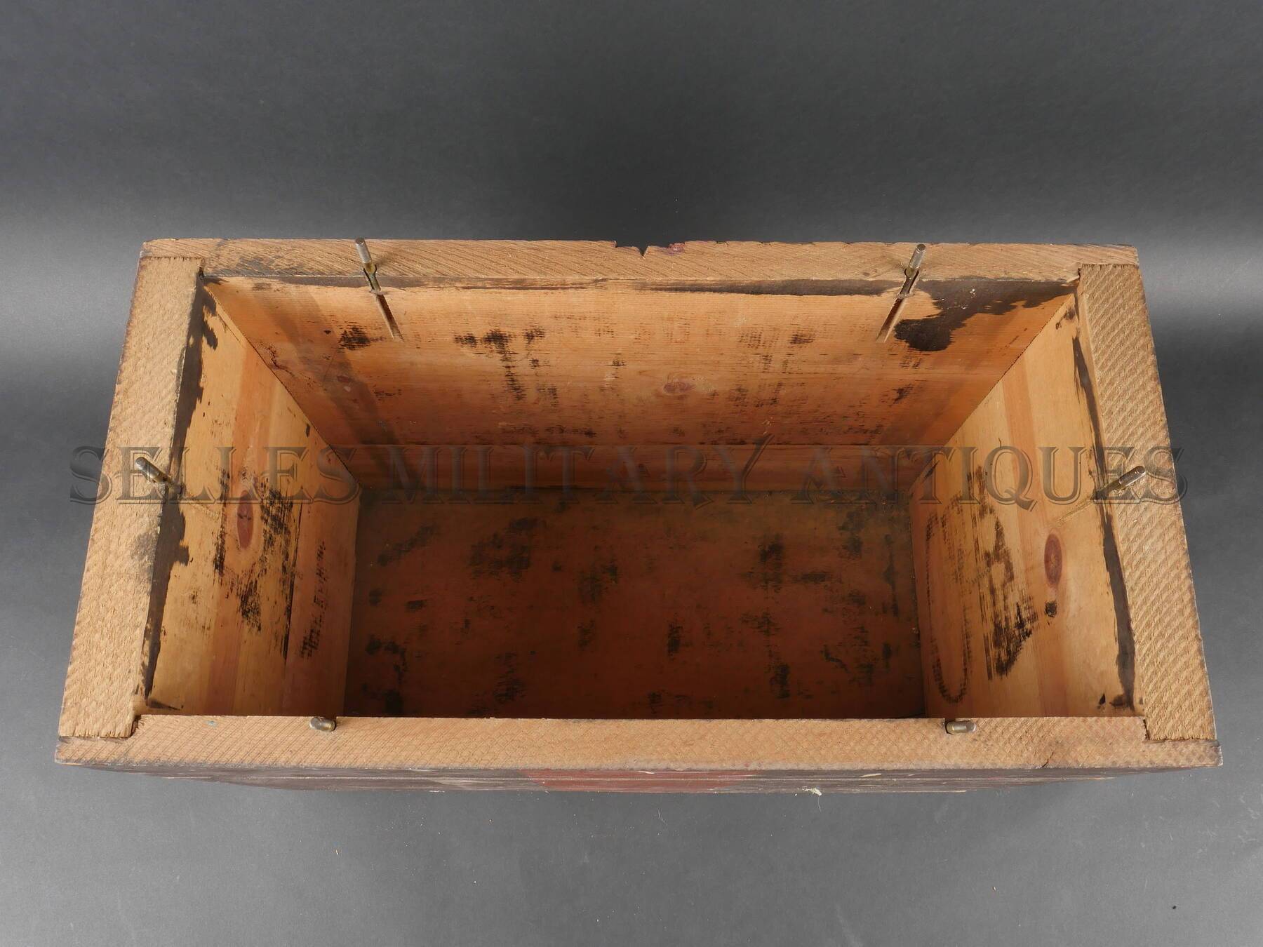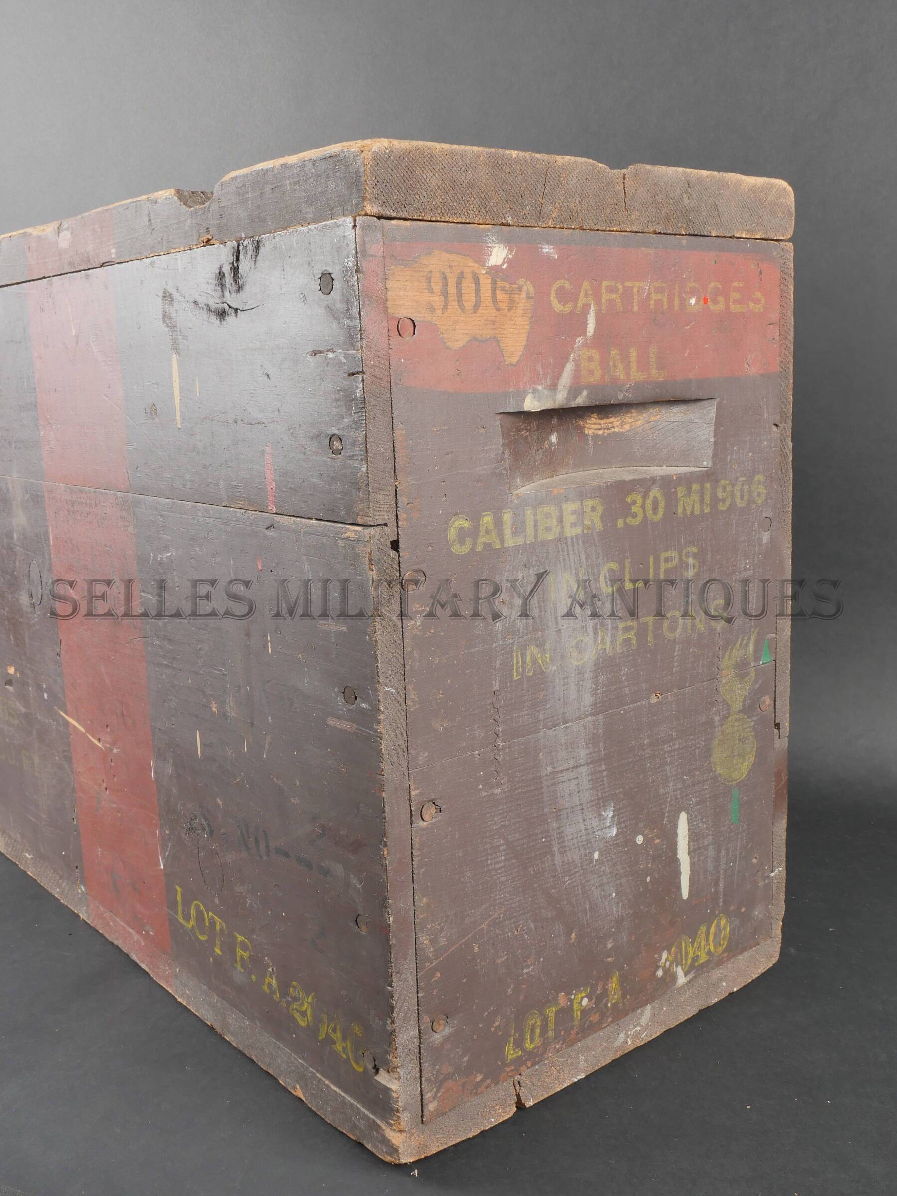 En bois, dimensions 46.5 x 37 x 23.5 cm, la caisse possède toujours la quasi totalité de sa peinture d'usine d''origine, de couleur marron foncé, de sa large bande verticale, de couleur rouge ainsi que de tous différents marquages présents et peint à la peinture jaune au pochoir : "900 Cartridges Ball Caliber .30 M1906..." ".. in clips, in carton..". Chose assez exceptionnelle, le couvercle, toujours manquant est ici présent. Seuls les écouvillons de fermeture sur le dessus sont manquants (remplaçable par des modèles similaires civils que l'on trouve facilement). La caisse est dans un état exceptionnel, sans défaut, récupérée en Normandie. RARE AVEC SON COUVERCLE.