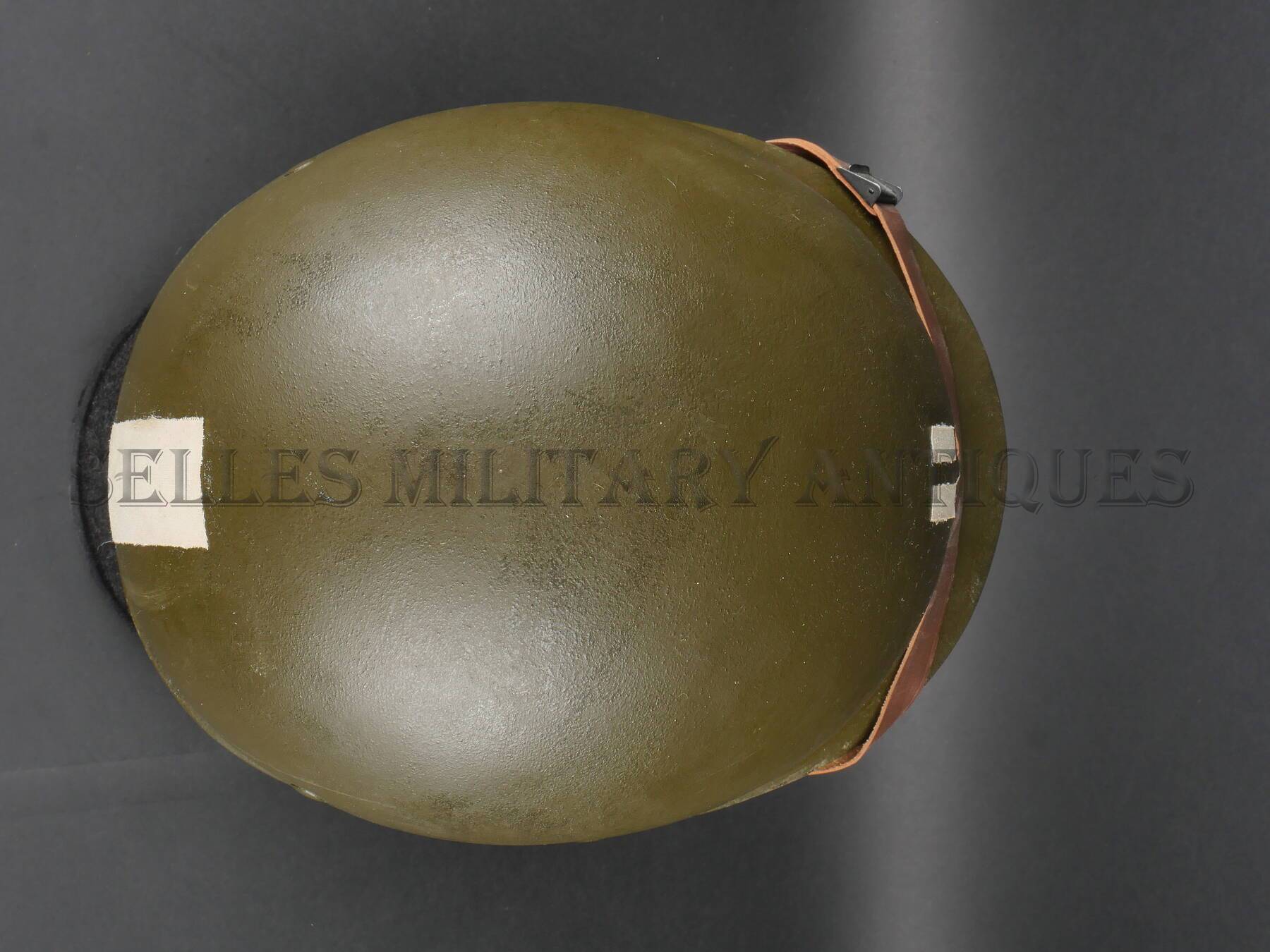 Casque de parachutiste, modèle M1C, absolument complet, comprenant un casque lourd et son sous-casque monté d'origine. Le casque lourd est en acier, avec attaches rectangulaires mobiles en acier, jonc en manganèse avec jointure à l'avant, fabrication "Mc Cord", numéro de fonderie présent à l'intérieur "1107B" (fabrication de novembre 1944), complet avec sa paire de jugulaire d'origine, de type airborne, de couleur O.D#3 (deuxième modèle avec double couture) avec boucle en laiton noirci du troisième modèle et pressions mâles permettant de maintenir le casque lourd avec le liner. La peinture verte texturée OD#7 d'usine d'origine est présente à plus de 90%. Le sous-casque est du modèle parachutiste, de fabrication "Westinghouse" (logo présent au fond du liner) avec suspension en toile OD#3 montée sur attaches en "A" inversés en laiton noirci. Les sangles de mentonnière sont en coton OD#7 avec boucles moulées peintes en vert, la mentonnière en cuir plate, marron à cinq trous avec doublure en peu de chamois. Le serre-tête est en cuir et toile et la nuquière en toile à pressions. La jugulaire en cuir amovible est du troisième modèle (fabrication "Dot"), cuir très souple. Le liner possède toujours 100% de sa peinture verte OD#7 repeinte d'origine. Un filet de camouflage, de maille moyenne marron (typique à la 101ème Airborne Division), de fabrication anglaise avec morceaux de toile de jutes complète ce superbe casque. Sur le casque lourd comme sur le liner a été apposé à postériori, un grade de capitaine ainsi qu'une superbe bande d'officier "ETO" "Follow Me" à l'aide de sparadrap blanc medical (facilement enlevable). Ce modèle de casque de parachutiste est typique aux opérations aéroportées qui ont eu cours après la Normandie ("Market Garden", "Bastogne" et "Varsity") et également distribué aux parachutistes français lors de la guerre d'Indochine. LE CASQUE EST DANS ETAT ASSEZ EXCEPTIONNEL, PROCHE DU NEUF DE STOCK ! RARE A SAISIR.