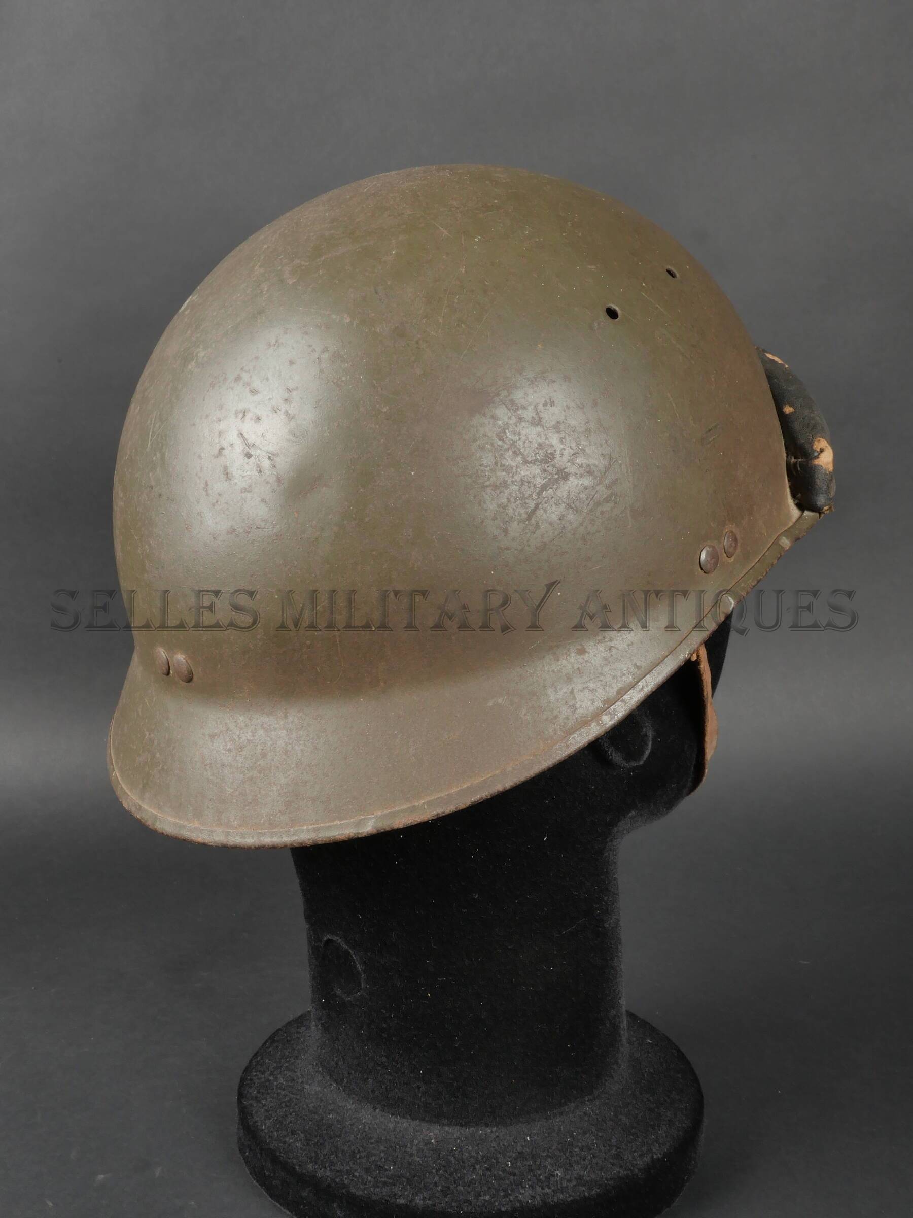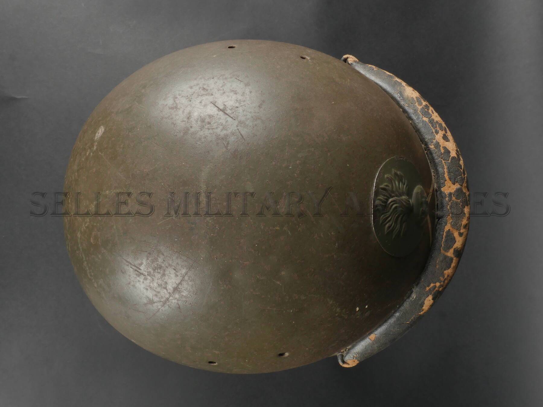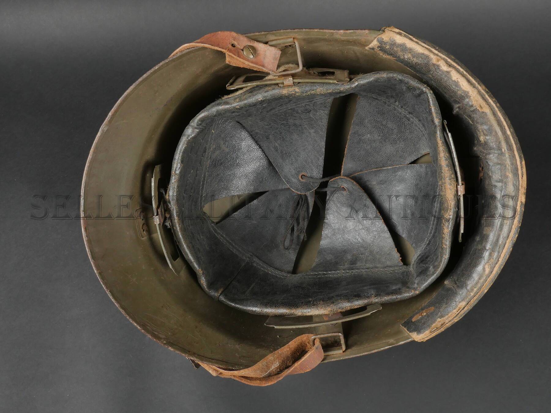 Casque modèle 1935 modifié 40, pour personnels des troupes motorisées, en acier, peinture d'origine de couleur kaki (brun jaunâtre) d'usine, présente à plus de 95%. Attribut frontale pastille à grenade modèle 1937, pour l'infanterie, la cavalerie et le train, de couleur kaki également, à quasiment 100% de peinture. Sous la pastille se trouve peint en blanc, à la main, un superbe grade de caporal à 100% de peinture. Bourrelet en cuir noir en bon état général (quelques manques sur la partie supérieure). La coiffe d'origine en cuir noir est toujours présente et en excellent état (typique au modèle 35/40), tout comme son lacet en coton noir d'origine. Taille "58" présente à l'intérieur de la coiffe sinon pas d'autre marquage visible sur le casque. Jugulaire en cuir marron d'origine, en excellent état, souple, avec boucle en acier coulissante. Très belle et légère patine générale, ensemble homogène. Ce type de casque fut principalement porté par l'armée de libération ainsi que par certains FFI. Cet exemplaire fut porté par un membre de la 2ème DB du général Leclerc lors de la libération de la ville de Paris le 25 août 1944 où le casque fut abandonné/perdu. Belle pièce peu courante pour ce modèle que l'on ne rencontre que très peu. A SAISIR.